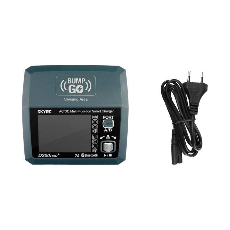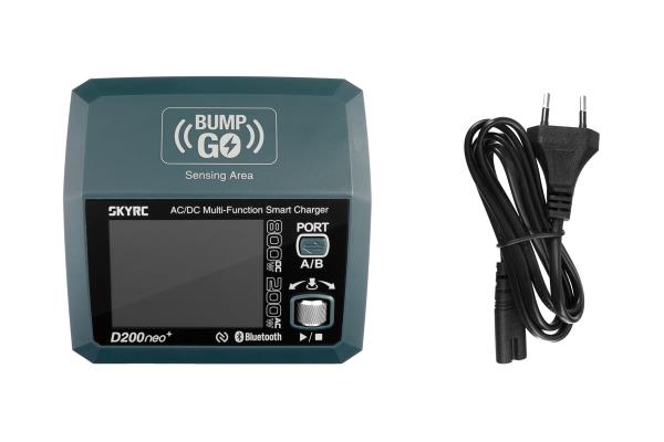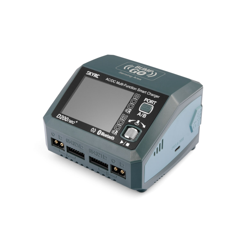 Dvoukanálový nabíječ SKY RC D200neo+ 800W byl konstruován se snahou poskytnout vše potřebné pro nabíjení dvou akumulátorů velkými proudy současně „pod jednou střechou" včetně síťového zdroje, s jednoduchou obsluhou a možností komunikace s aplikací SkyCharger. D200neo+ umožňuje nabíjet a vybíjet běžné typy článků (NiCd, NiMH, Li-poly, Li-ion, Li-Fe, Li-HV, Pb), navíc jsou oba kanály vybaveny vestavěnými šestikanálovými balancery, které zajišťují velmi bezpečné a komfortní nabíjení lithiových akumulátorů. Může také pracovat v režimu paralelního nabíjení, kdy oba kanály nabíjejí jeden akumulátor proudem 20-35 A. Při připojení externího vybíječe BD350 potom umožňuje vybíjení proudem až 40 A při max výkonu 350 W.