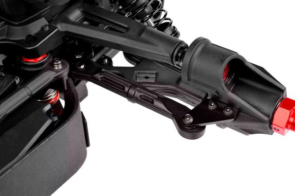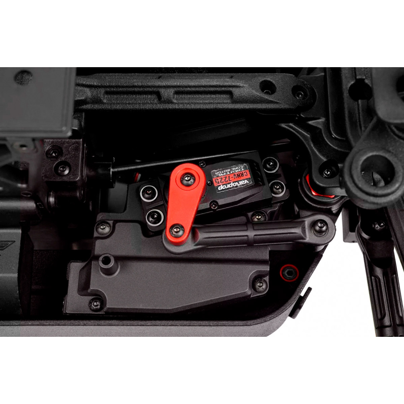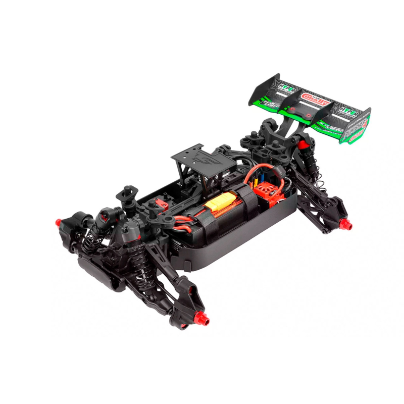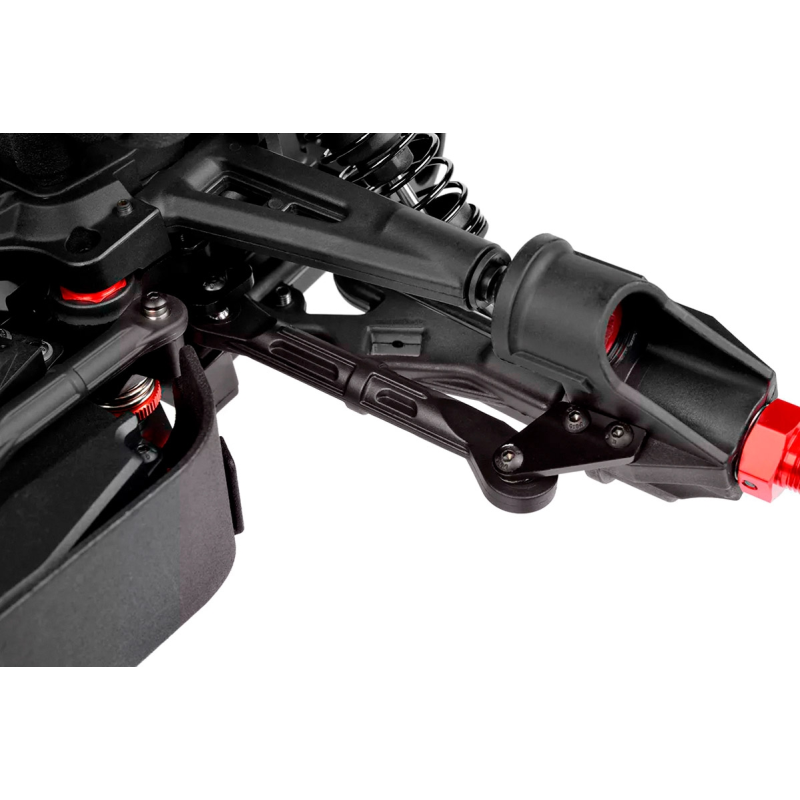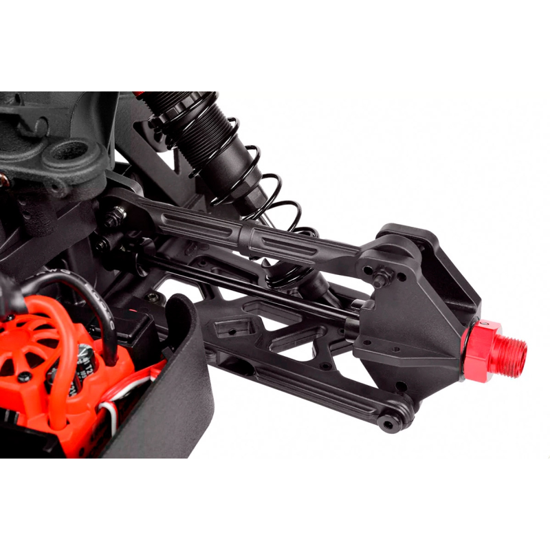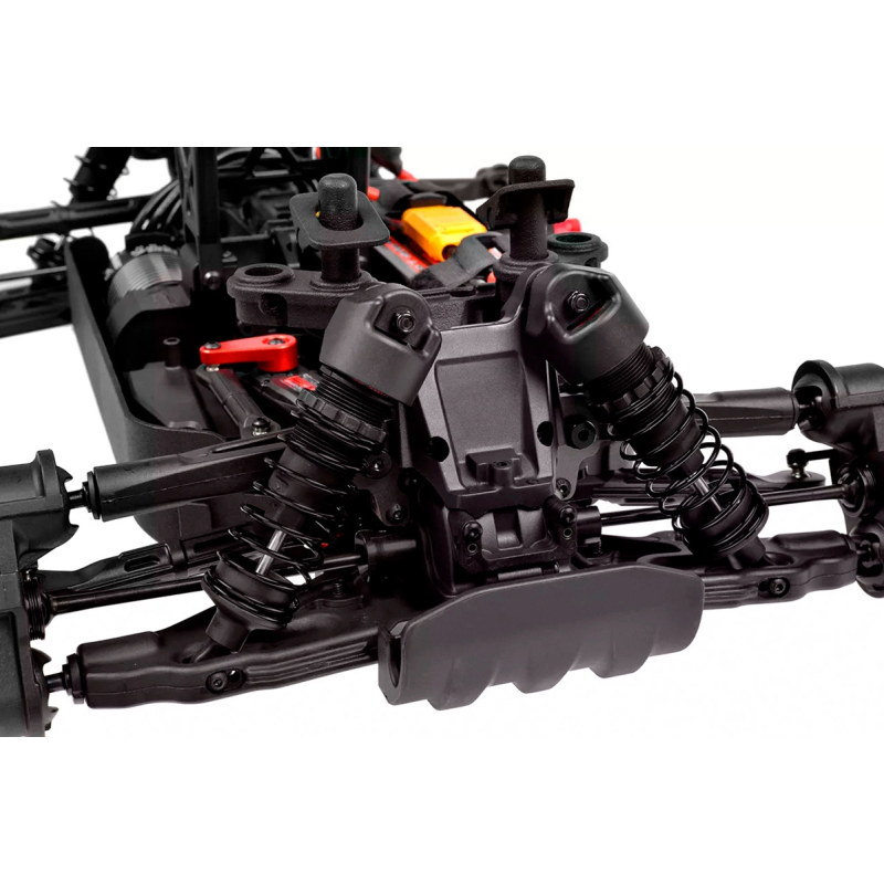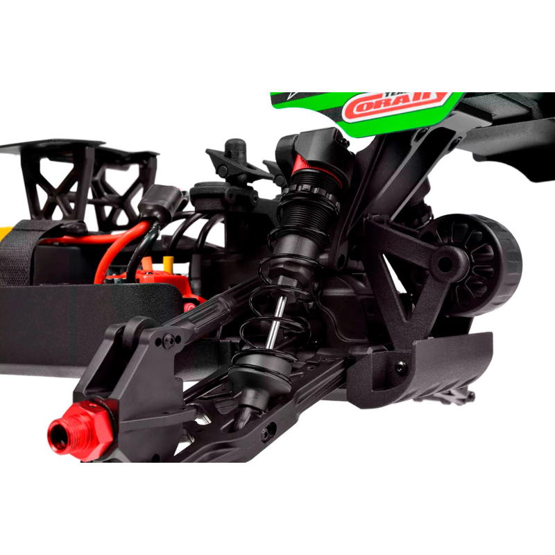 Jeho hybridní hliníkový držák motoru nabízí tři polohy motoru pro přesné nastavení vůle pastorku. Zesílené hnací ústrojí s ocelovými unašeči a robustním hlavním převodovým převodem 52T zajišťuje dlouhou životnost. Široké těhlice z Kagamy a Sketeru dodávají stabilitu a schopnosti v terénu, zatímco nové wheelie kolečko pomáhá zvládat obrovský výkon. Od střídavého motoru Kuron 725 až po regulátor Torox 135 - každá součástka přispívá ke vzrušující maximální rychlosti přes 80 km/h. Vysílač CT2S 2,4 GHz, systém vyztužení podvozku a křídlo s vysokou přítlačnou silou doplňují balíček, takže Punisher4 je skutečným důkazem odkazu inovací a výkonu firmy Team Corally.