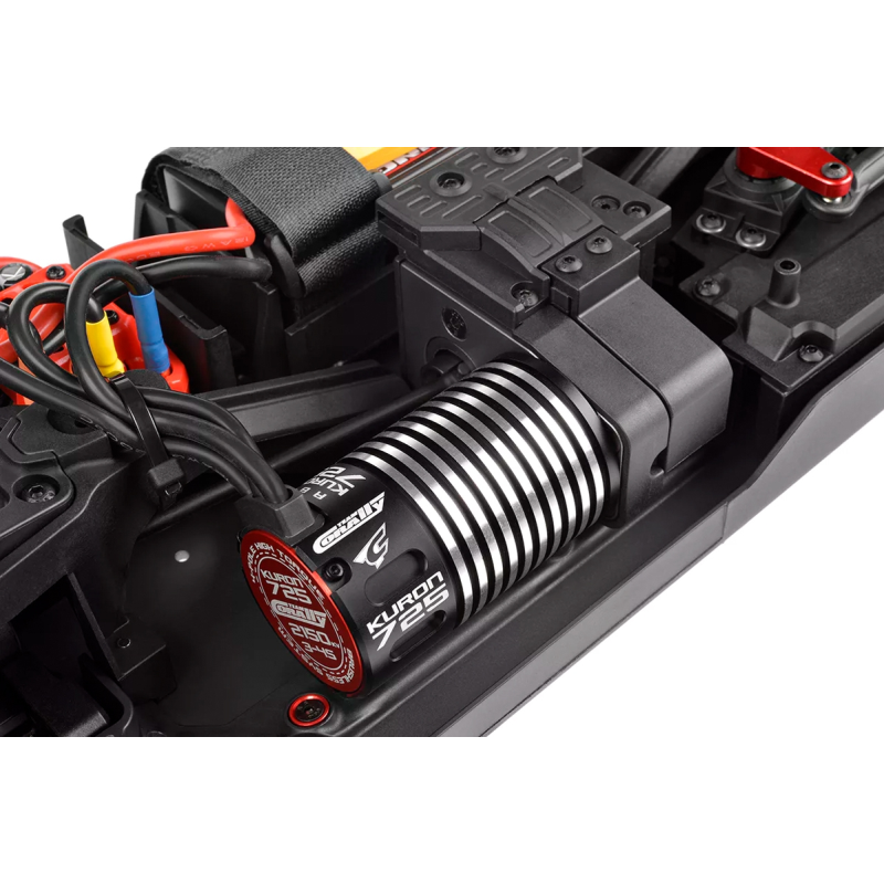 Hned po vybalení z krabice je model Syncro připraven vyrazit na trať. Jeho pokročilý regulátor PULSE G2 135 ESC poskytuje plynulý, ovladatelný výkon, zatímco střídavý motor Kuron 725 zajišťuje, že budete mít vždy dostatek rychlosti. Díky robustnímu digitálnímu servu HV7225, které se stará o řízení, si užijete přesné ovládání v jakémkoli terénu.