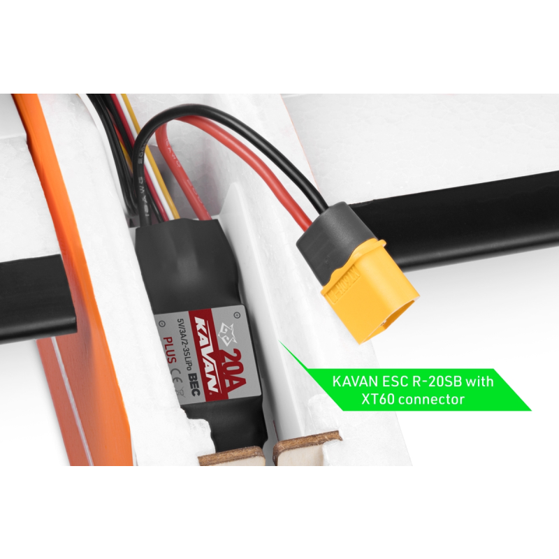 Trup modelu je zhotoven z vysoce odolného pěnového EPO (extrudovaného polyolefinu) s důkladnými vnitřními uhlíkovými výztuhami. V přídi je nainstalován střídavý elektromotor C2820-1450 se sklopnou vrtulí 7x6“ a regulátorem KAVAN R-20SB Plus. Kryt kabiny je odnímatelný, upevňuje se pomocí čepu vpředu a mechanického uzávěru vzadu. V přídi najdete dostatek prostoru pro pohonný akumulátor a přijímač. Mikroserva s kovovými převody pro ovládání polovin křídla, směrovky a výškovky jsou uložena v prostoru pod křídlem. Ocasní plochy jsou ovládány lanovody, poloviny křídla nastavitelnými táhly s kulovými čepy.