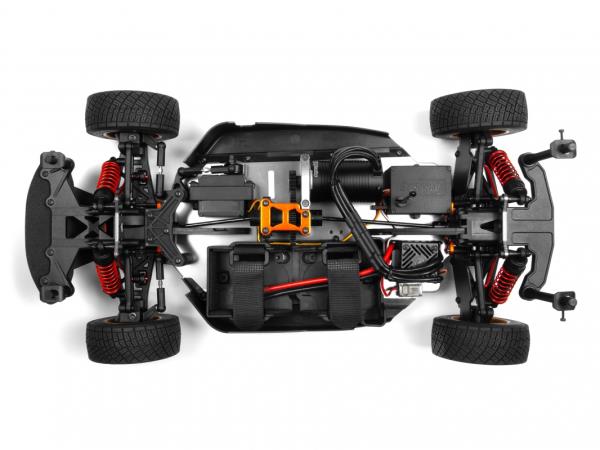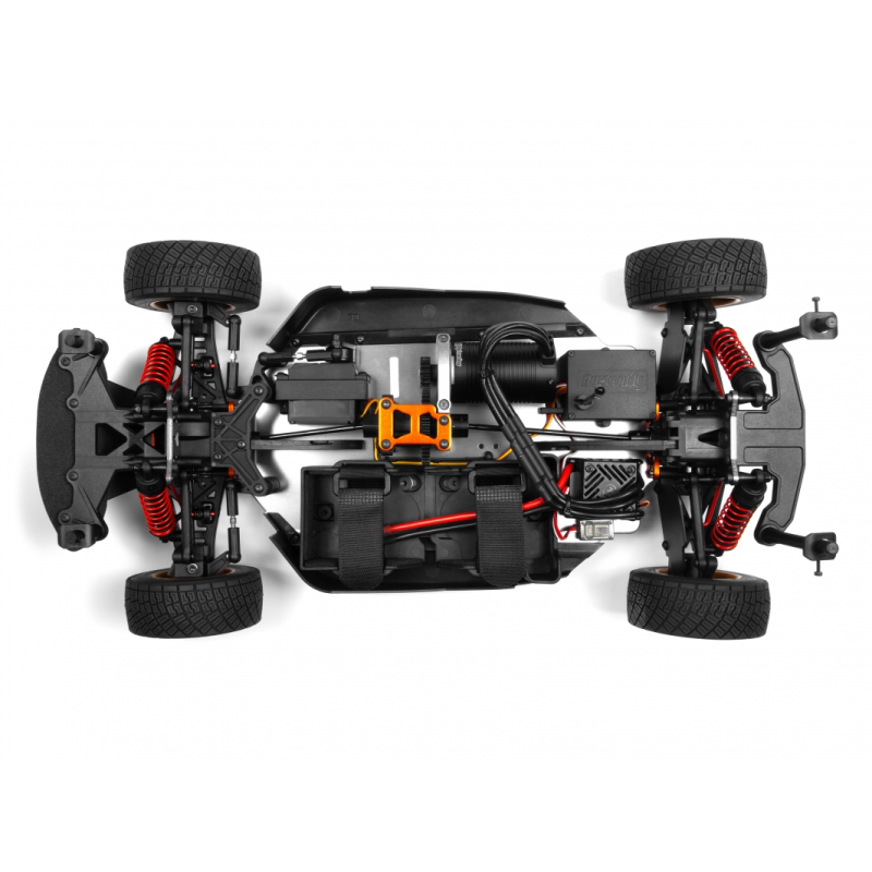 Model stejně, jako předloha, má poháněny všechna čtyři kola (4WD). Základem podvozku je šasi z tvrdého stříbrně eloxovaného 3mm silného duralu, které zajišťuje dostatečnou pevnost v ohybu a krutu. Šasi je po stranách doplněno o plastové prahy, které minimalizují prostor pro vniknutí nečistot. Výkon je na kola přenášen přes stálý převod, planetové diferenciály a ocelové poloosy. Podvozek je kompletně osazen kuličkovými ložisky. Kola jsou nezávisle zavěšena na spodních lichoběžníkových ramenech, které jsou stejně, jako závěsy vyrobeny z plastu plněného skelnými vlákny. O odpružení a tlumení se stará čtveřice olejových tlumičů s vinutými pružinami. K výborným jízdním vlastnostem přispívají skrutné stabilizátory na přední i zadní nápravě. Zadní náprava a hlavně tlumiče jsou před odletujícím pískem a kamením chráněny plastovými zástěrkami.