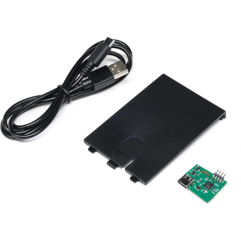 balení obsahuje adaptér vysílače DXS, zadní kryt vysílače s otvorem pro konektor, USB-A / USB-C kabel, manuál EN, DE, FR, IT.