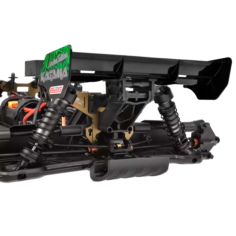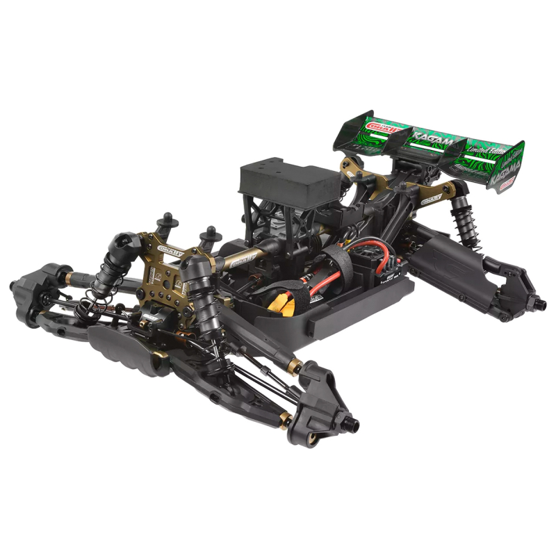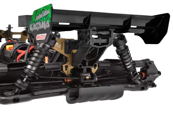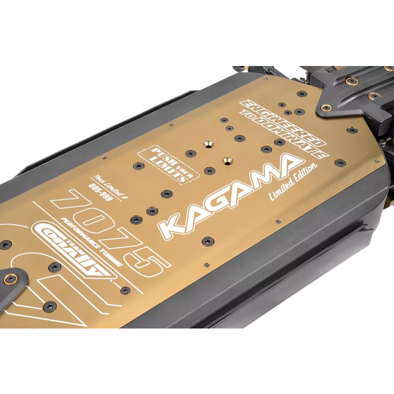Kagama Limited Edition vylepšuje osvědčený výkon standardního modelu Kagama a zároveň zachovává jeho osvědčené komponenty. Mnoho hliníkových dílů nyní má jedinečnou eloxovanou povrchovou úpravu Limited Edition, díky čemuž je skutečně jedinečný. Podvozek, vzpěry odpružení, středový díl řízení a matice pro nastavení pivot ball čepů nyní mají exkluzivní zlatou povrchovou úpravu. Středový diferenciál, náboje kol, kroužky nastavení předpětí pružin tlumičů a páka serva mají elegantní černou eloxovanou povrchovou úpravu. Všimli jste si jich všech?