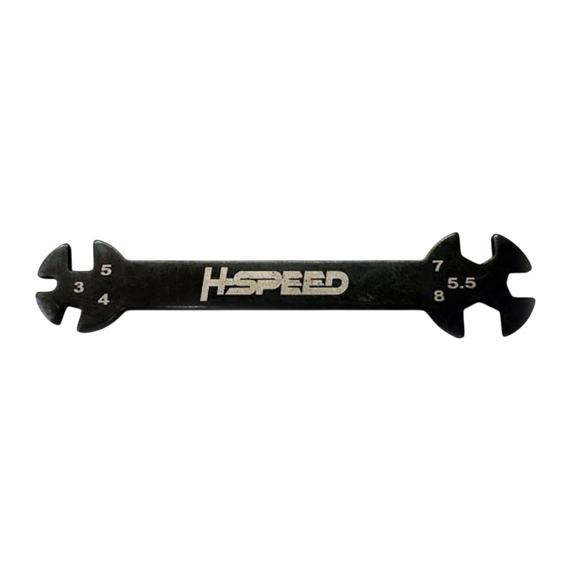 Multifunkční ocelový plochý klíč otevřený na šestihranné hlavy 3/4/5/5.5/7/8mm s černěným povrchem a logem H-speed. Délka 120 mm.