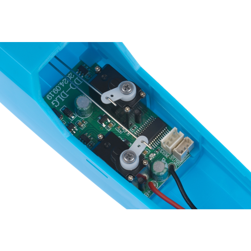 Pro ovládání modelu budete potřebovat nejméně čtyřkanálovou RC soupravu s miniaturním přijímačem (schopným pracovat s napájením z 1S LiPo akumulátoru), který je vybaven sériovým S.BUS nebo DSM2 výstupem. Přijímač prostě připojíte do odpovídajícího vstupu na desce elektroniky v modelu - přiřazení kanálů dekodéru je pevné: výškovka je kanál 2, směrovka kanál 4.