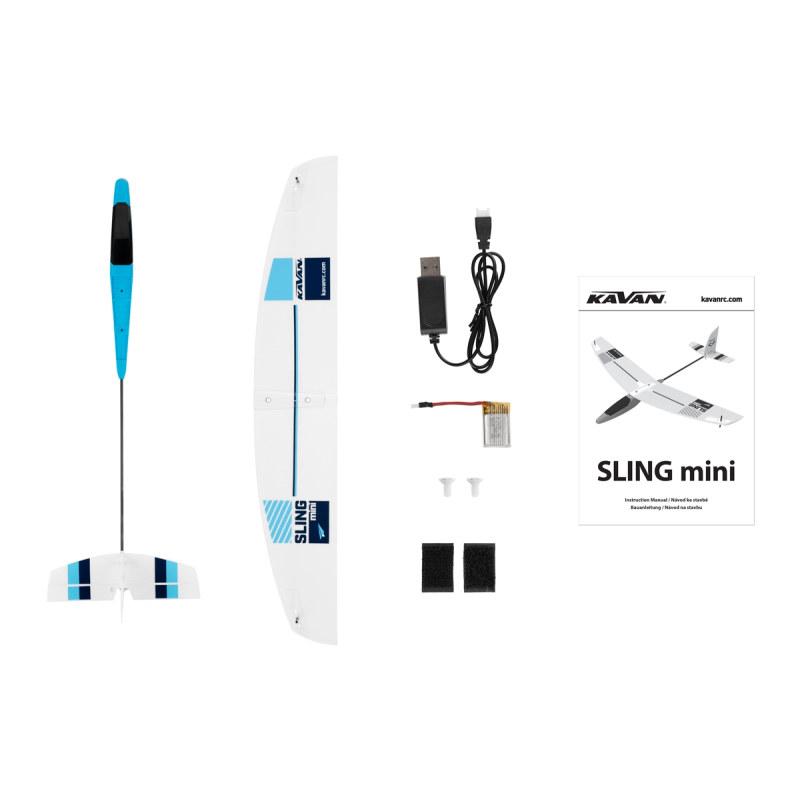 ARF set obsahuje: hotový model SLING Mini, přijímačový LiPo akumulátor, USB nabíječ a návod.