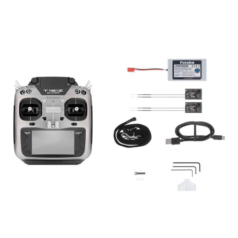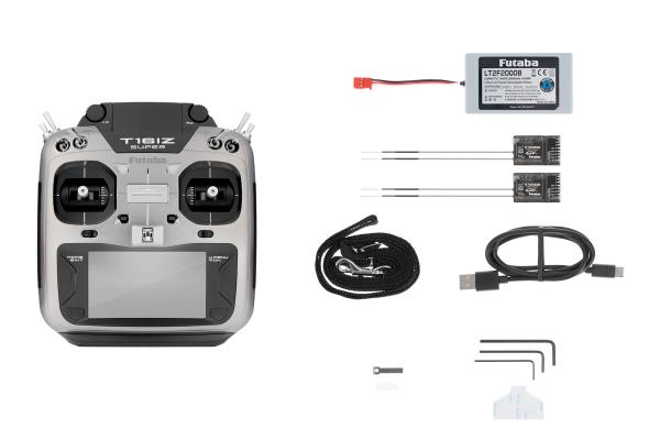 Vysílač T16IZ SUPER ve skříňce dokonale padnoucí do ruky je vybaven přesnými křížovými ovladači s nastavitelnou aretací/neutralizací, 8 přepínači, 2 posuvnými ovladači, 4 digitálními trimy a 2 otočnými proporcionálními ovladači. K programování slouží dvojice tlačítek a velký podsvícený barevný dotykový LCD displej zajišťující snadnou orientaci v intuitivním menu. T16IZ SUPER má paměť pro 30 modelů neomezeně rozšiřitelnou pomocí mikroSD karty a širokou škálu pokročilých mixových funkcí pro akrobatická letadla, větroně, vrtulníky a multikoptéry. Kromě zobrazení telemetrických dat na displeji je k dispozici hlasový výstup telemetrie v zásuvce pro sluchátko (není součástí soupravy). T16IZ SUPER je rovněž vybaven zásuvkou učitel-žák a zásuvkou pro programování a nastavování S.BUS serv a gyroskopických systémů CGY755/CGY760R nebo GYA553. USB datová zásuvka na horní straně vysílače možňuje používat T16IZ SUPER po připojení k PC USB kabelem jako ovladač pro RC simulátor bez potřeby dodatečného USB rozhraní.