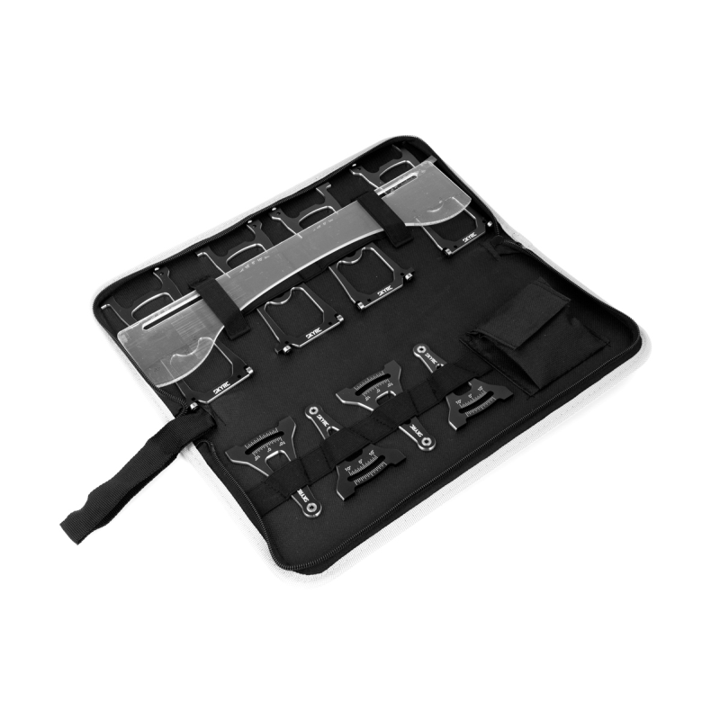 SET-UP sada SkyRC je vhodná pro všechny buggy 1/8 se 17mm šestihrannými unašeči kol. Je navržena tak, aby přesně měřila a nastavovala odklony, sbíhavost/rozbíhavost, úhel řízení a záklon rejdového čepu (caster) vašeho vozu. Dobře seřízený vůz podá na trati ten nejlepší výkon a pomůže vám vyhrávat závody.