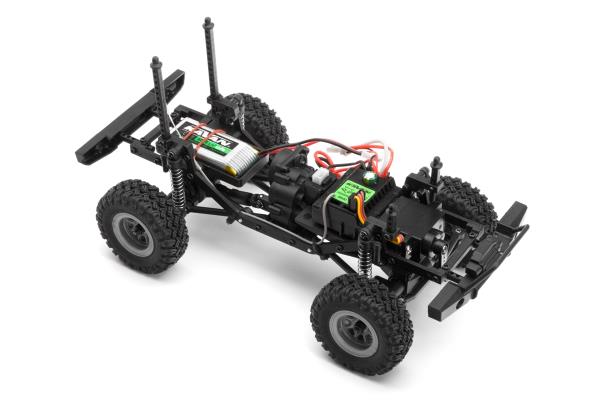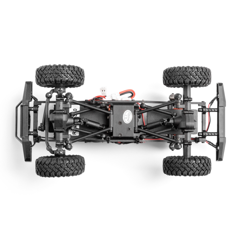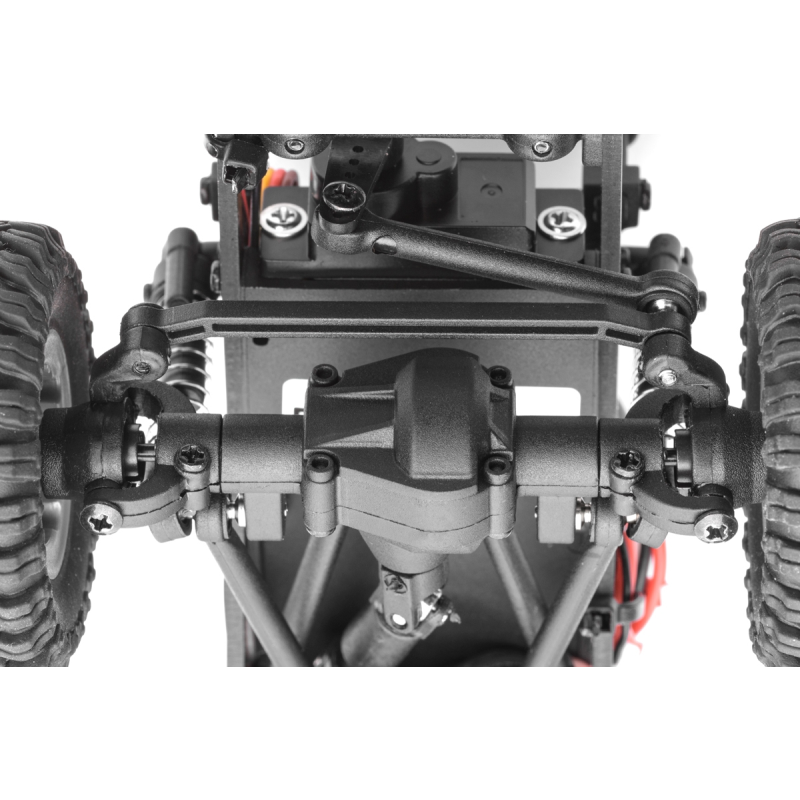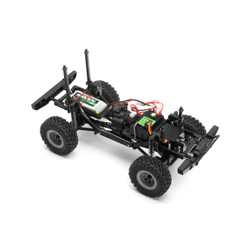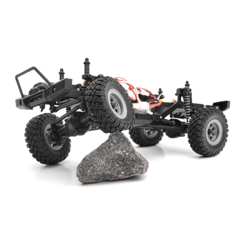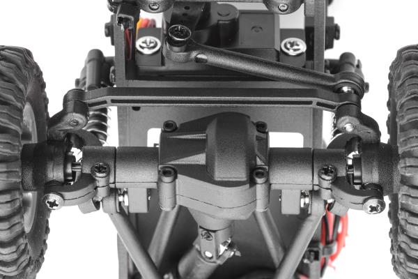 Pevný kovový rám spolu s 4bodovým zavěšením náprav a měkkými tlumiči poskytuje dostatečnou světlou výšku, nájezdové úhly a artikulaci pro překonávání náročných překážek. Stálý náhon všech kol, uzavřené diferenciály a měkké pneumatiky s hlubokým vzorkem vždy zaručí dostatek trakce.