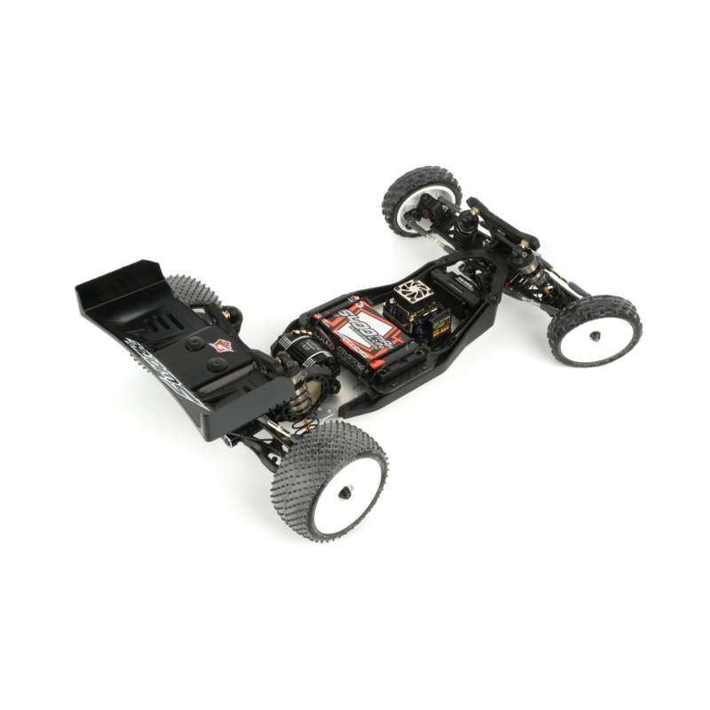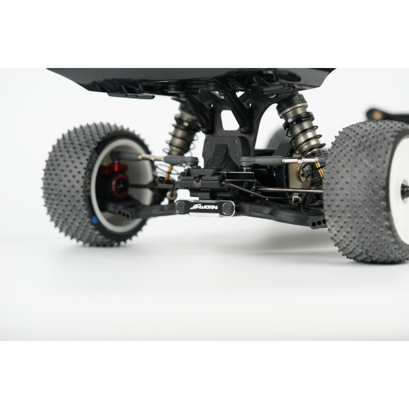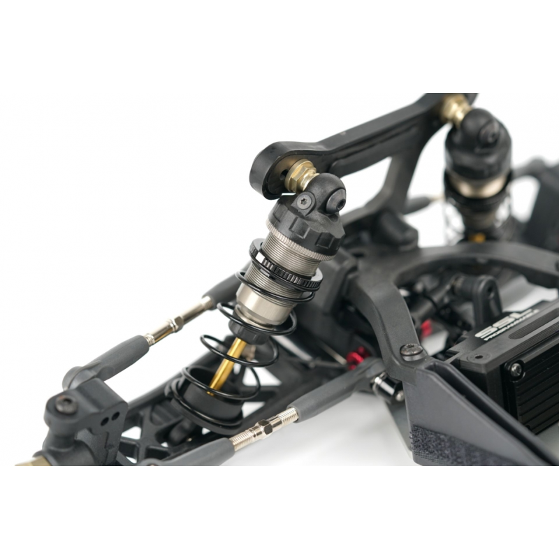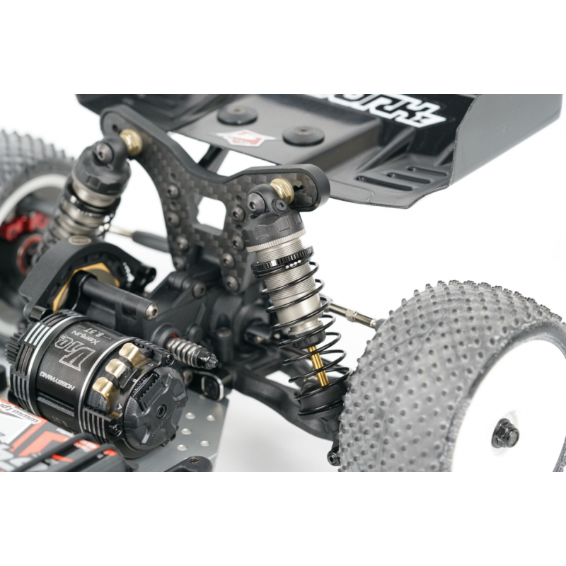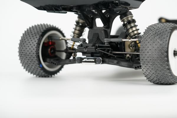 Buggy je vybavena nově navrženým 13mm systémem tlumičů BBS Big Bore Shock System od SWORKz, který je obsahuje přesná emulzní plastová víčka a zesílené pístky tlumičů pro lepší odolnost. Osy tlumičů potažené teflonem zajišťují ultra hladkou odezvu tlumení, zatímco 4mm karbonové věže tlumičů poskytují výjimečnou pevnost. Sada také obsahuje ochranné kryty věží tlumičů a nejnovější 13mm pružiny BBS Black Line s miskami pružin se zámky proti otočení pro konzistentní výkon a výrazné zlepšení ovladatelnosti při skocích.