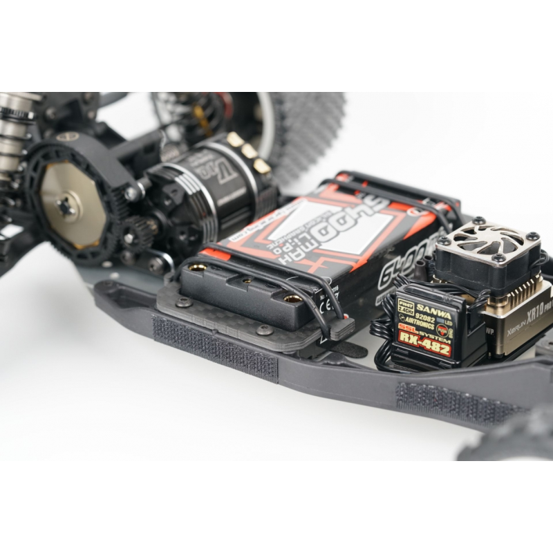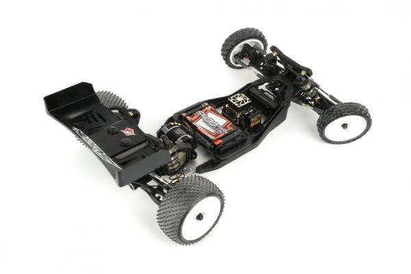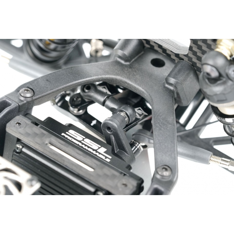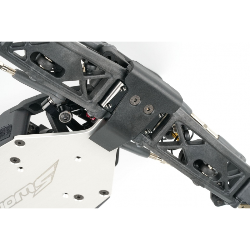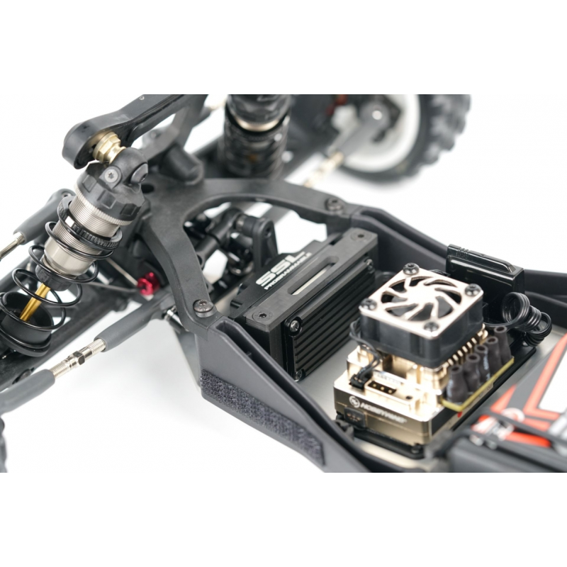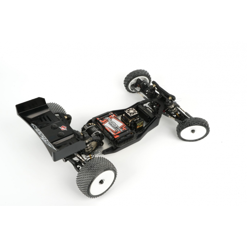Buggy je vybavena nově navrženým 13mm systémem tlumičů BBS Big Bore Shock System od SWORKz, který je obsahuje přesná emulzní plastová víčka a zesílené pístky tlumičů pro lepší odolnost. Osy tlumičů potažené teflonem zajišťují ultra hladkou odezvu tlumení, zatímco 4mm karbonové věže tlumičů poskytují výjimečnou pevnost. Sada také obsahuje ochranné kryty věží tlumičů a nejnovější 13mm pružiny BBS Black Line s miskami pružin se zámky proti otočení pro konzistentní výkon a výrazné zlepšení ovladatelnosti při skocích.