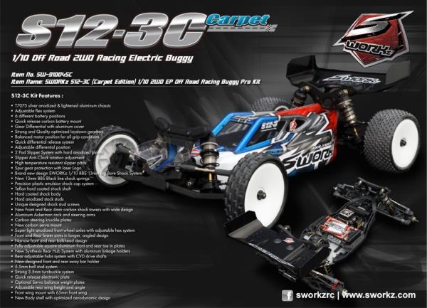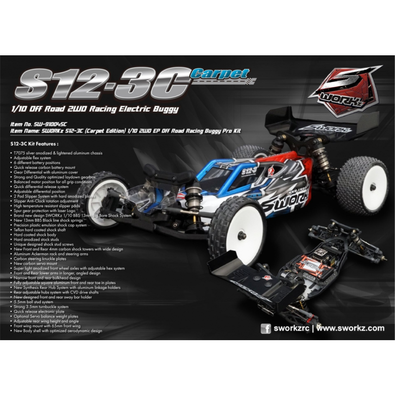 SWORKz S12-3C Carpet Edition je špičková buggy v měřítku 1/10 s pohonem 2WD, navržená zejména pro závody na koberci a umělé trávě (astroturf). Tento model vychází z osvědčené platformy S12-2C EVO a představuje kompletní redesign, který přináší vyšší rychlost v zatáčkách a snadné ovládání na površích s vysokou trakcí.