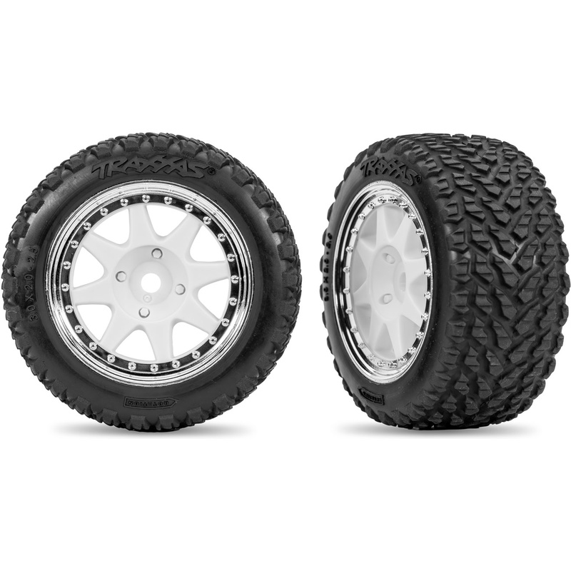 Kompletní zadní kola pro RC model auta Traxxas Mini Rally. Disk 8-spoke 2.5" s chromovým kroužkem, pneu Rally, zadní (2 ks). Rozměry ø76x51mm. Unašeč - šestihran 12 mm.