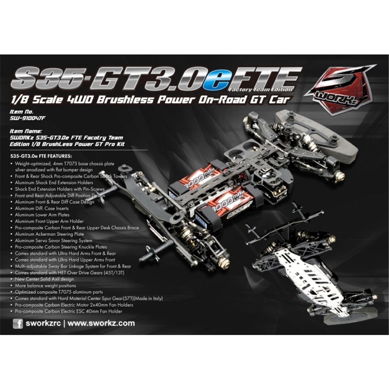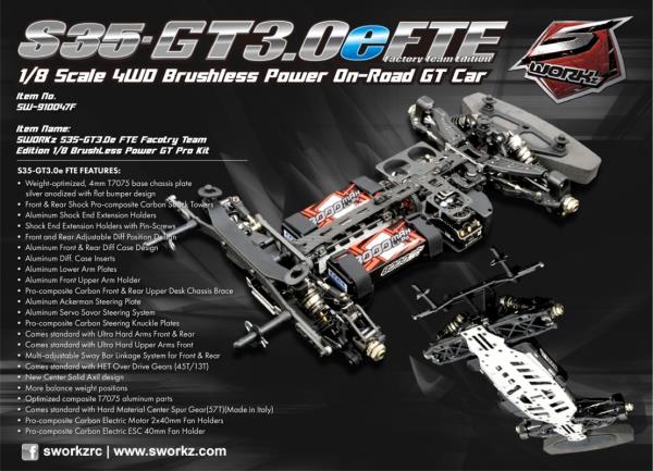 S35-GT3.0e Factory Team Edition (FTE) je vylepšenou verzí modelu S35-GT2.2e FTE, který zvítězil v mistrovství světa IFMAR E-GT 2023. Jednalo se o speciální projekt vytvořený pro jezdce SWORKz GT, aby mohli soutěžit v GT šampionátu. Cílem je být vždy rychlejší, lehčí a mít snadnější pocit z jízdy.
