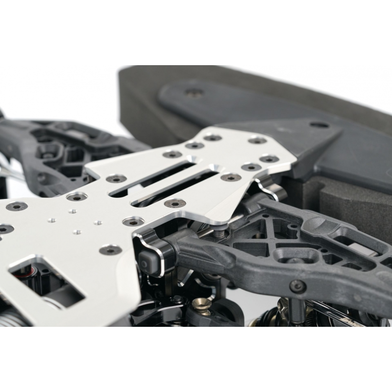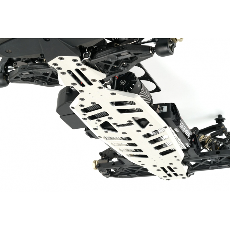 - Hmotnostně optimalizované 4mm hlavní plato podvozku T7075, eloxované stříbrnou barvou, s plochým designem nárazníku.