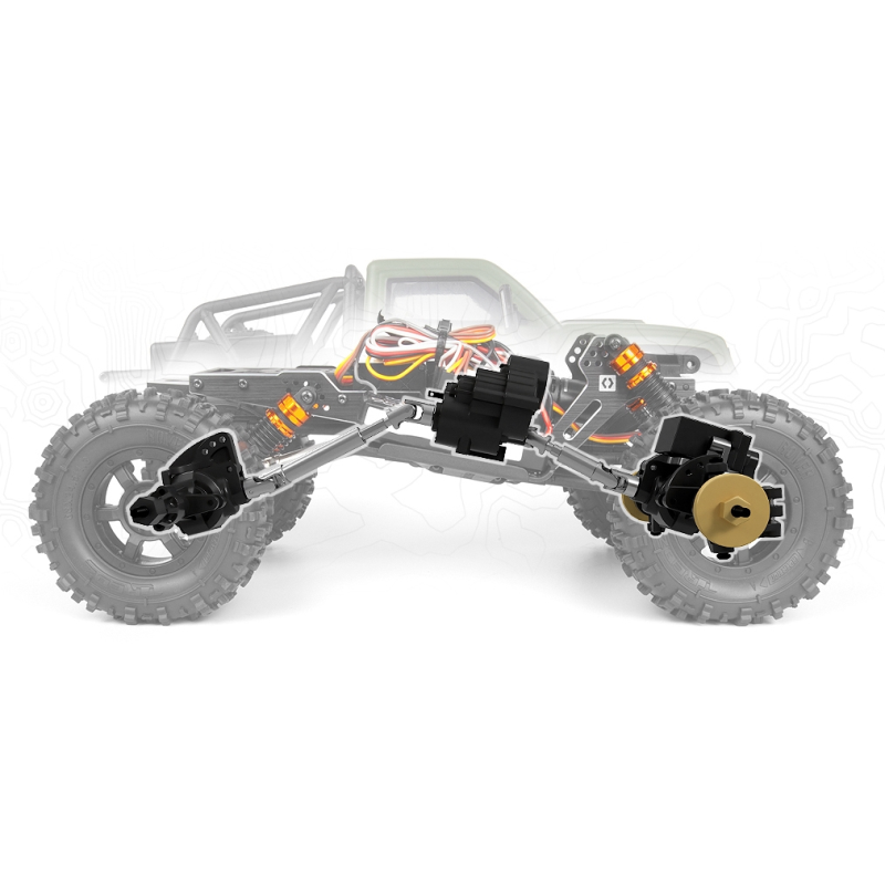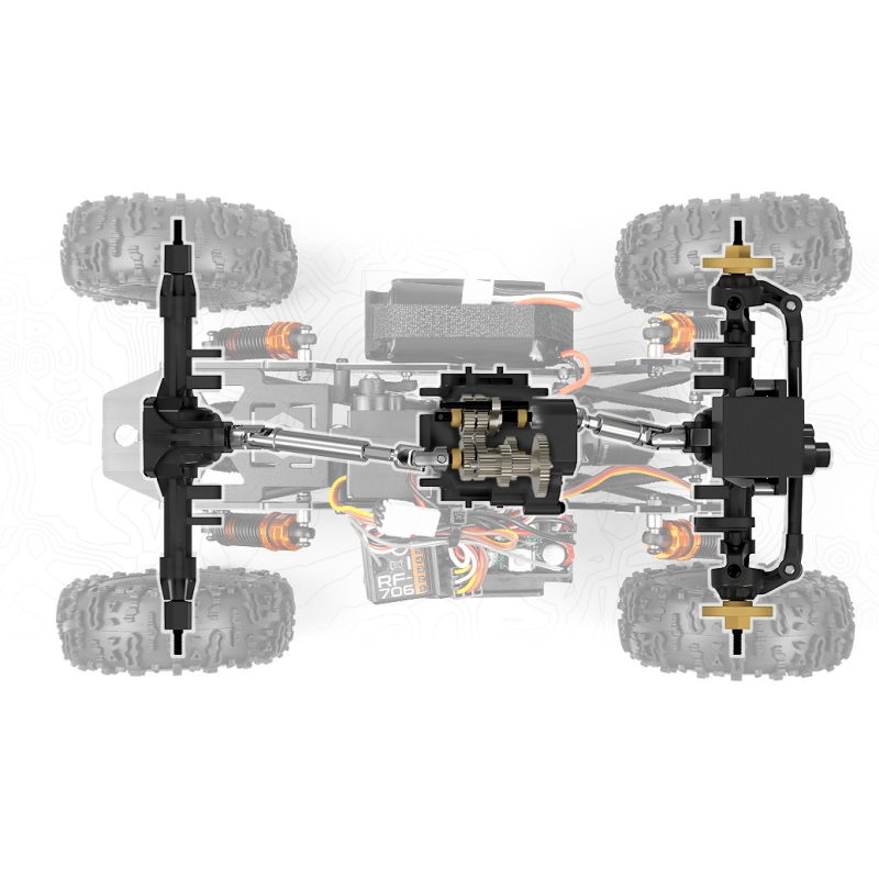 Pevný 2mm hliníkový podvozek, centrální servem ovládaná převodovka half-DIG, vyhlazená spodní strana, přední převodovka s overdrive a přidané nízko namontované mosazné komponenty společně poskytují působivou ovladatelnost a trakci v kompaktním balení.