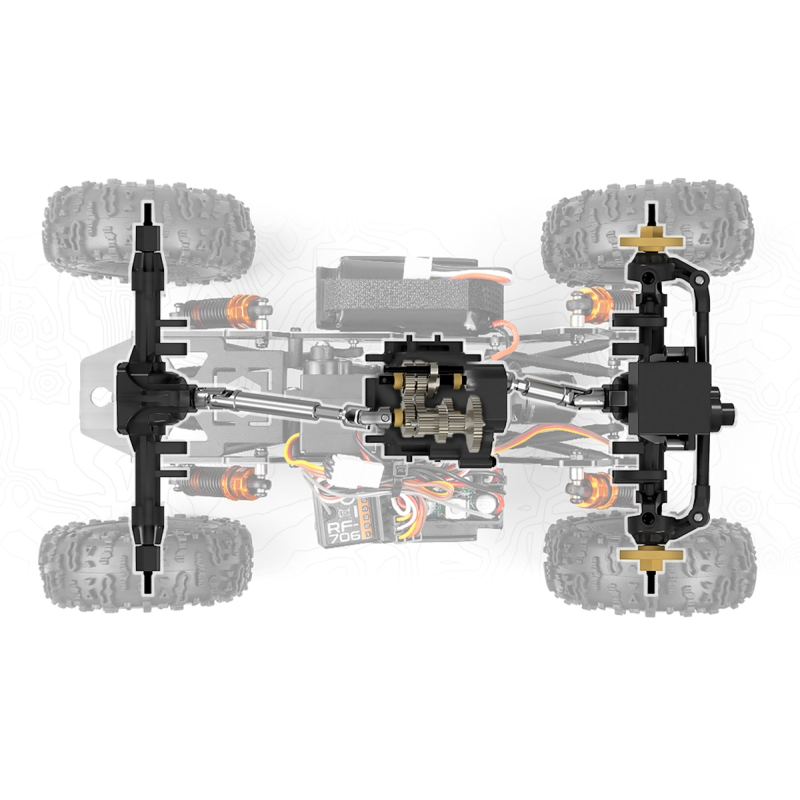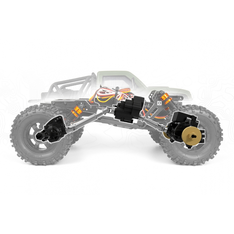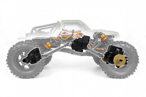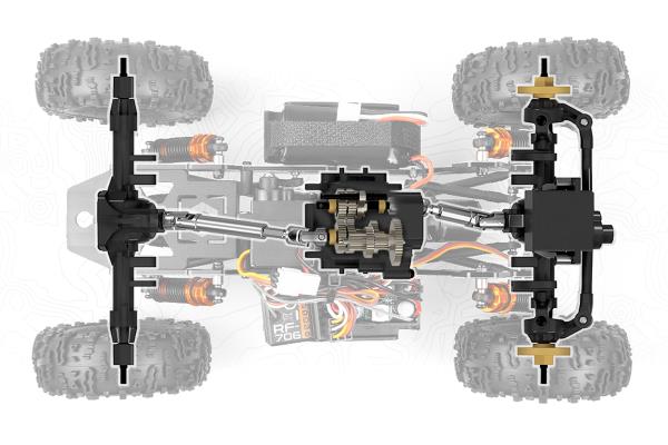 Pevný 2mm hliníkový podvozek, centrální servem ovládaná převodovka half-DIG, vyhlazená spodní strana, přední převodovka s overdrive a přidané nízko namontované mosazné komponenty společně poskytují působivou ovladatelnost a trakci v kompaktním balení.
