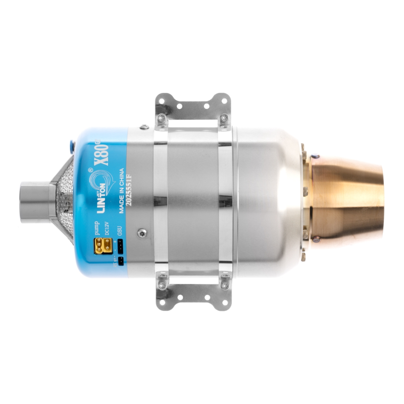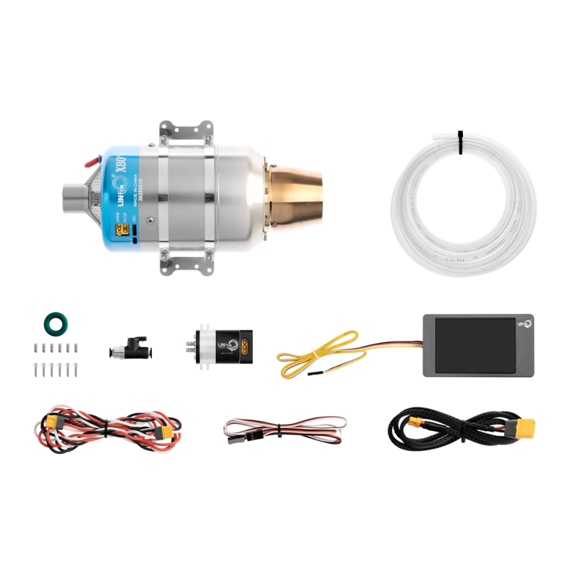 Sada motoru obsahuje: Proudový motor Linton X80-GT s řídící jednotkou, motorové lože, pozemní programovací jednotku, palivové čerpadlo, sadu upevňovacích šroubů, palivové potrubí, sadu kabelů a náhradních dílů, návod.