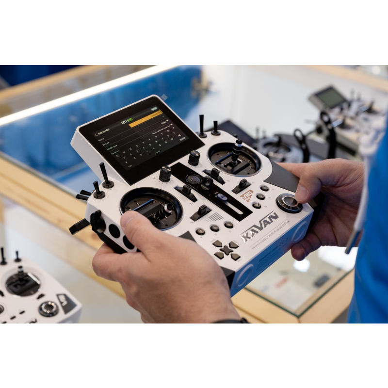 Pro ovládání dalších funkcí slouží 6 třípolohových přepínačů, 2 dvoupolohové (1 momentový) přepínače, 2 postranní otočné ovladače, 6 uživatelsky programovatelných tlačítek (vpředu) a dvě momentová tlačítka (vzadu). Vestavěný 6osý gyroskopický senzor lze nastavit pro ovládání kanálu plynu, řízení výchylek mixu a slouží i pro probuzení displeje. Páčky trimů a knoflíky jsou celokovové, precizně obráběné na CNC. Návrh rozmístění ovladačů a ergonomie těla je výsledkem několika desítek hodin testování a ladění týmem KAVAN.