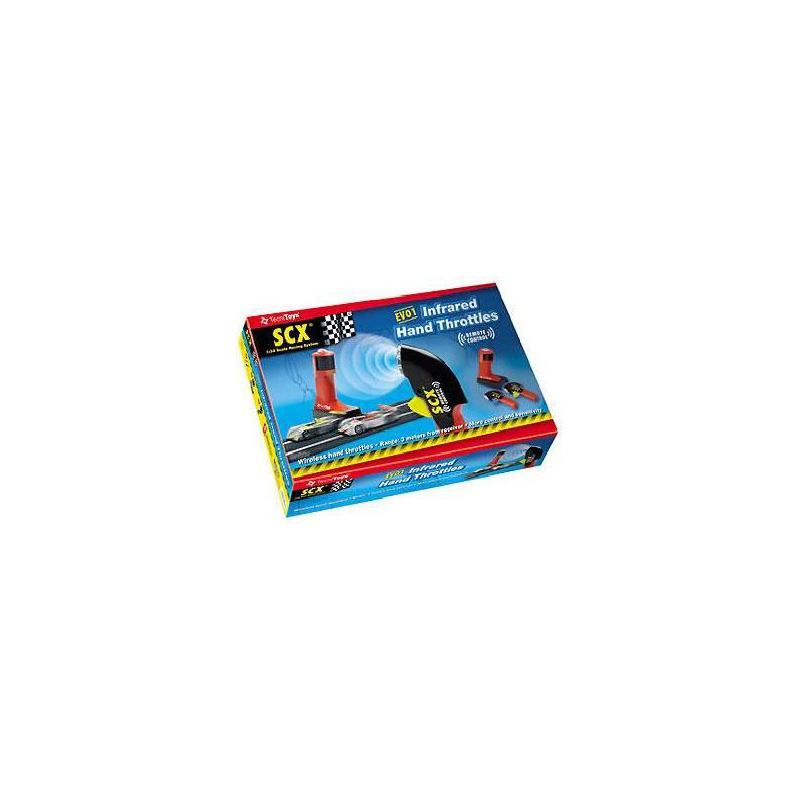 Originální příslušenství k analogové autodráze SCX se starší verzí traťových dílů a hranatými konektory.Infračervený ovladač se připojí pomocí věže k přípojnému panelu, ovladače bezdrátově řídí rychlost jízdy aut.