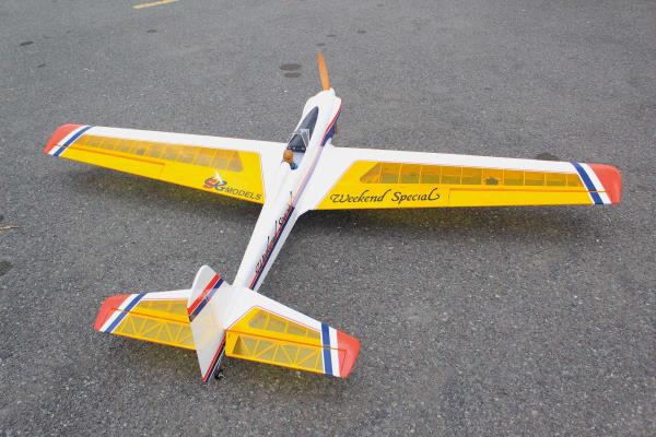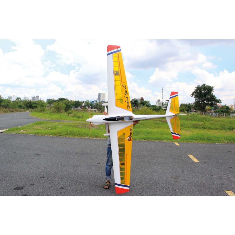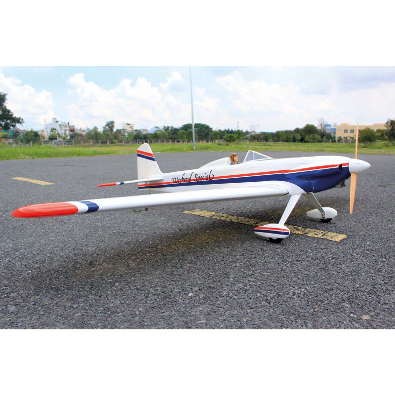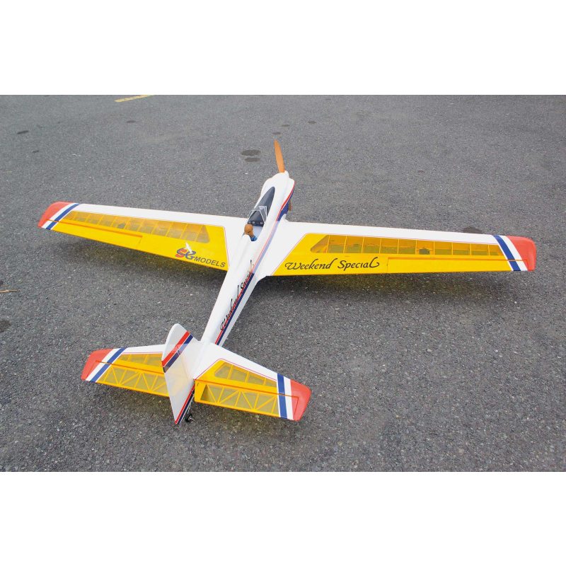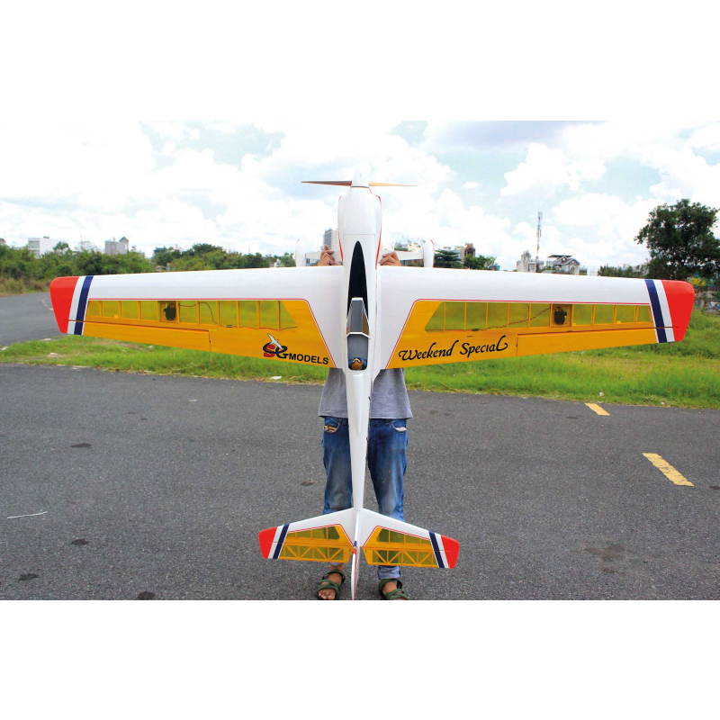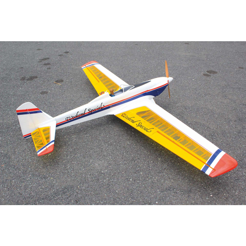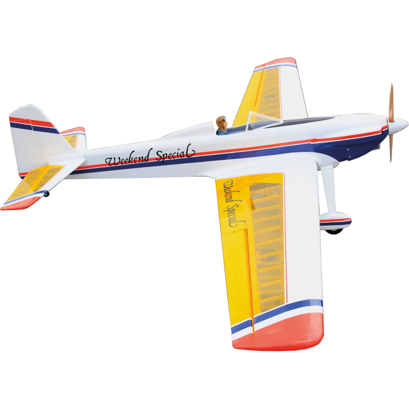 Super Weekend Special – nádherně zpracovaným, velkoryse dimenzovaným RC sportovním letounem, navrženým pro snadné ovládání a vzrušující akrobatické výkony. Díky velké nosné ploše a lehké balzové konstrukci nabízí tento model klidný, tolerantní letový projev, takže je radost jej pilotovat i při minimální rychlosti, a zároveň je kdykoli připraven přejít na vaše povely do dynamických manévrů. Model se může pochlubit obrovským rozpětím 2500mm, lehkou a přitom velmi pevnou konstrukcí a profesionálním potahem z fólie v jasných barvách, což zajišťuje stabilní let, skvělou viditelnost a přesnou ovladatelnost při sportovním i akrobatickém létání. Dvoudílná nasouvací křídla usnadňují transport i rychlou montáž, profilové ocasní plochy zvyšují aerodynamickou stabilitu a odnímatelný kabinový kryt poskytuje pohodlný přístup k elektronice a akumulátoru. Model je vybaven 3" PU koly s odolnými plastovými náboji, předinstalovanou palivovou nádrží s příslušenstvím a doplněn lakovanou laminátovou motorovou kapotou, kryty křídel a kompletní sadou montážního hardware.