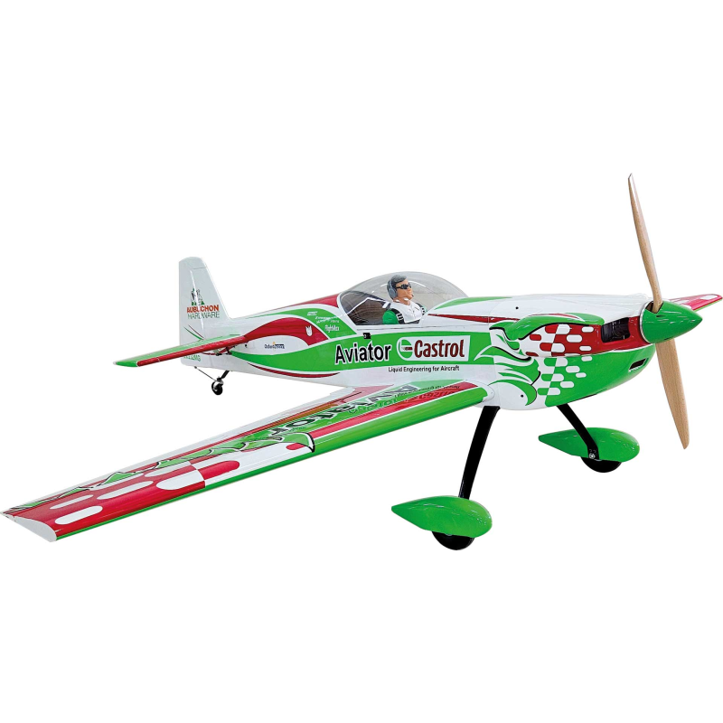 Konstrukce je precizně vyrobena z kvalitní balzy a překližky a v nejvíce namáhaných částech je vyztužena uhlíkovými prvky, aby byla dosažena maximální pevnost při co nejnižší hmotnosti. Křídlo i ocasní plochy jsou vybaveny uhlíkovými spojkami – hlavní křídlení trubkou o průměru 25 mm a horizontální ocasní trubkou o průměru 12 mm, které zajišťují výjimečnou torzní tuhost celé konstrukce. Model je optimalizován pro snadný transport a je dodáván ve dvou samostatných kartonech, což usnadňuje manipulaci a snižuje riziko poškození. Rychlou montáž na letišti umožňuje CNC univerzální rychloupínací systém, který zajišťuje bezpečné uchycení křídel. Křídla jsou navíc plně odnímatelná a vybavená rychloupínacími prvky, takže příprava k letu je otázkou několika minut. Velká odnímatelná kabina poskytuje okamžitý přístup ke všem servům, elektronice i palivovému systému. Model je profesionálně potažen kvalitní nažehlovací fólií v atraktivním Castrol Aviator zbarvení, které zajišťuje výbornou viditelnost a dodává modelu maketový vzhled. Realismus dále podtrhuje detailně zpracovaný kokpit s továrně instalovanou a lakovanou pilotní figurou v čirém překrytu kabiny. Součástí je také lakovaná laminátová motorová kapota, laminátové kryty kol a sada maketových samolepek, které dotvářejí celkový vzhled. Model je vybaven funkčními klapkami a maketovými panty, které rozšiřují letový rozsah a zlepšují akrobatické schopnosti. Uhlíkový hlavní podvozek je doplněn robustními 5,5" PU koly vhodnými pro starty a přistání na trávě i asfaltu. CNC obráběné hliníkové ostruhové kolo je vyztuženo uhlíkovou vzpěrou a doplněno maketovým gumovým kolem. V balení nechybí ani kužel. Součástí je také kompletní palivový systém s 700ml průhlednou nádrží a potřebnými přípojkami pro spolehlivý provoz. Obsah stavebnice: Model v provedení ARF s kvalitní dřevěnou konstrukcí, která je již z výroby kompletně potažena nažehlovací fólií. Součástí výbavy je uhlíkový hlavní podvozek i uhlíkové zadní podvozkové kolečko, doplněné o laminátové (GFK) kryty kol, GFK motorovou kapotu a GFK páky kormidel. V balení nechybí ani veškeré drobné montážní příslušenství, jako jsou panty, šrouby a další potřebné díly. K dispozici je také palivová nádrž, kužel, kola a kompletní uhlíkové spojky křídel a ocasních ploch, které zajišťují pevné a přesné uchycení. Pro snadné sestavení je přiložen obrázkový montážní návod, díky kterému je stavba rychlá a přehledná. Návod