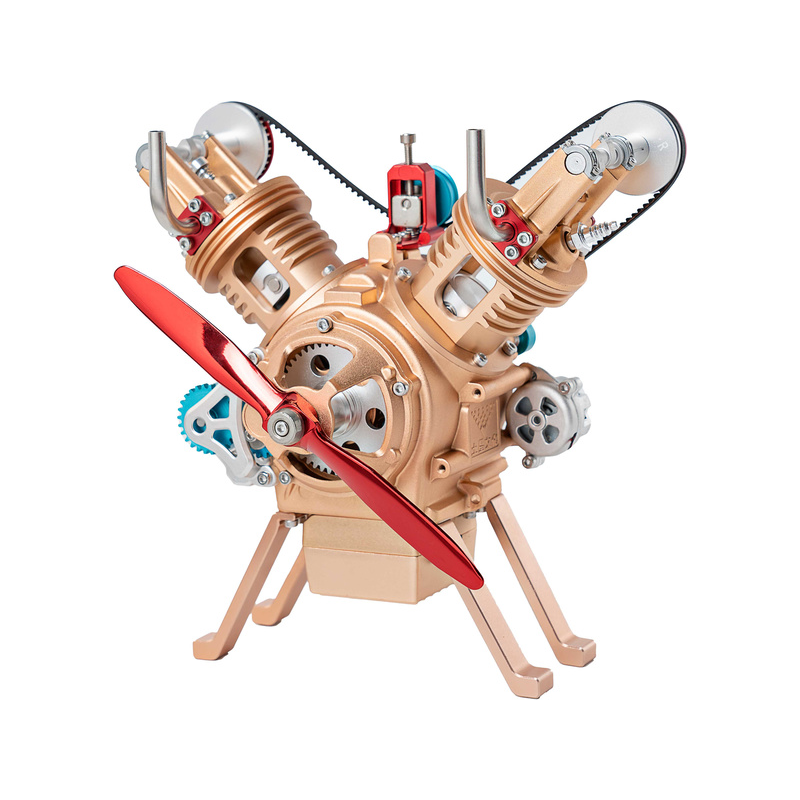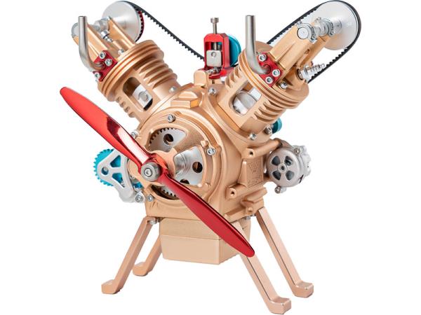 Stavebnice precizního kovového modelu Teching motor V2. Detailně reprodukovaná konstrukce reálného motoru s otevřenými hlavami. Model obsahuje realistické mechanické funkce - pohyb pístů, ventilů, hřídelí a rozvodů. Elektrické otáčení motoru. Výstavní model.