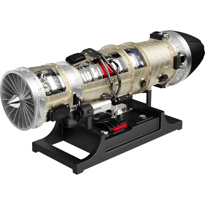 Stavebnice precizního kovového modelu Teching - nízkoobtokový proudový motor. Autenticky zpracovaná konstrukce skutečného motoru. Realistické mechanické funkce - pohyb rotoru, nastavitelné lamely trysky. Elektrické otáčení, podsvícená tryska, zvukové a kouřové efekty. Výstavní model.