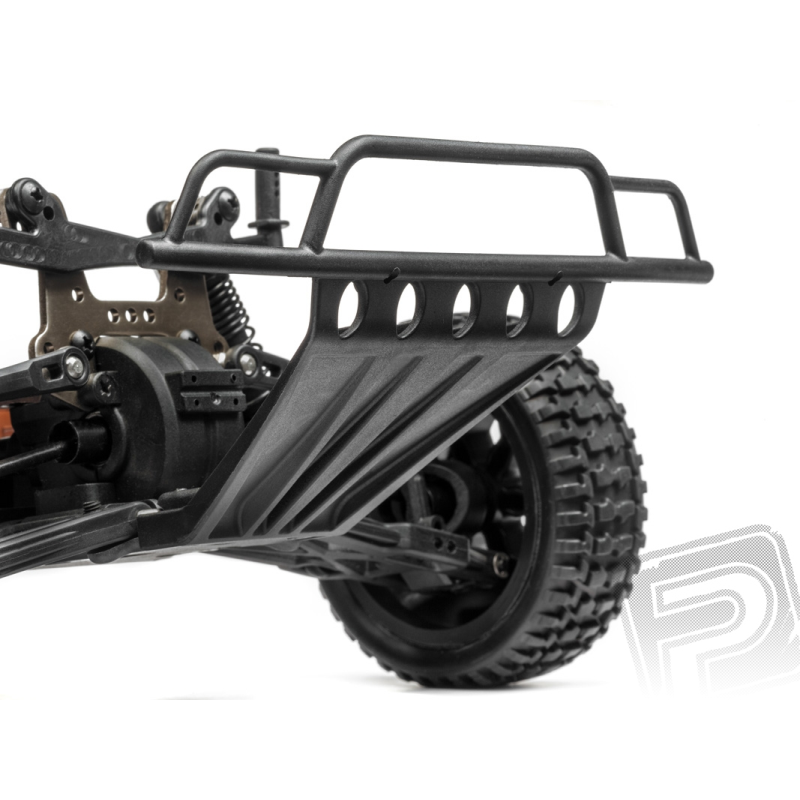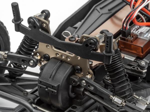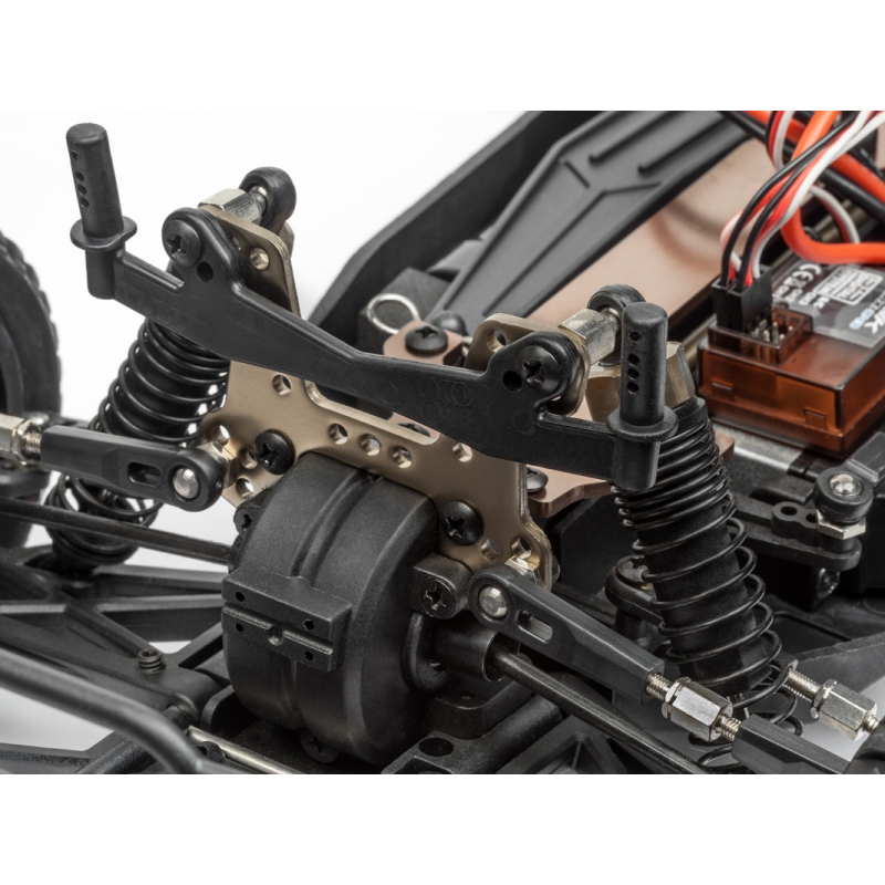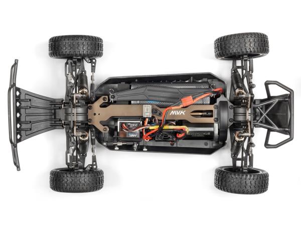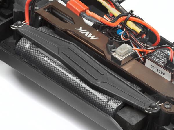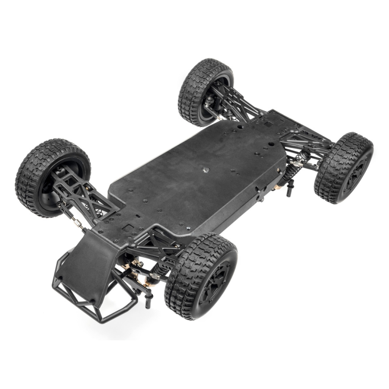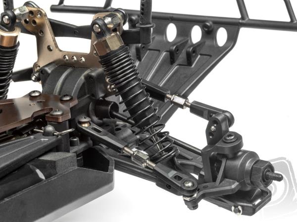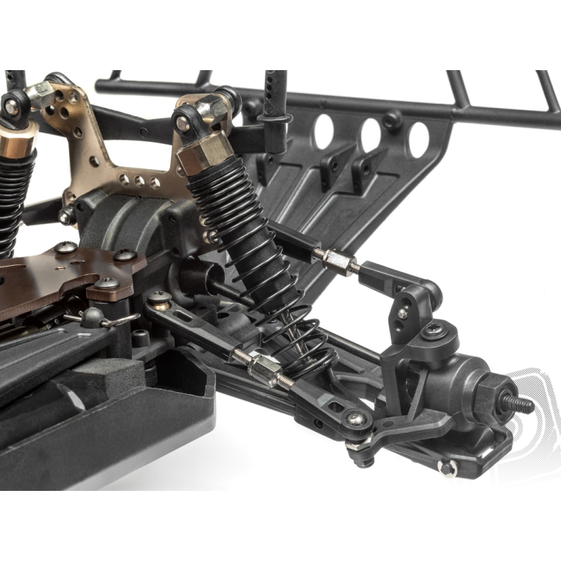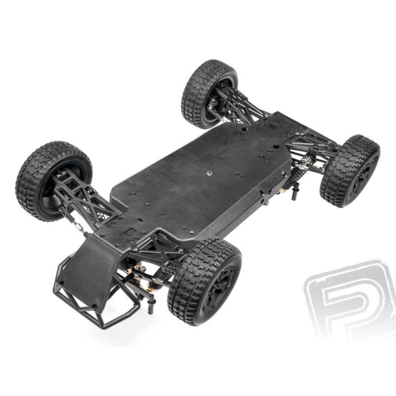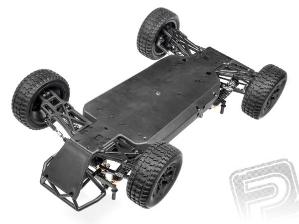 Konstrukce s "bočnicemi zajišťuje dostatečnou pevnost, které napomáhá horní výztuha. Z důvodu co nejlepšího vyvážení je váha pohonného akumulátoru a motoru soustředěna na střed šasi. Stálý převod je opatřen účinným zakrytováním, který chrání převod před poškozením o prachu a kamínků. Diferenciály jsou planetové uložené v kuličkových ložiscích stejně, jako náboje kol apod. Kola jsou nezávisle zavěšena na lichoběžníkových ramenou a odpružena olejovými tlumiči. Geometrie je nastavitelná pomocí spojovacích tyčí s pravo-levým závitem. K ovládání je použita volantová RC souprava v pásmu 2,4Ghz