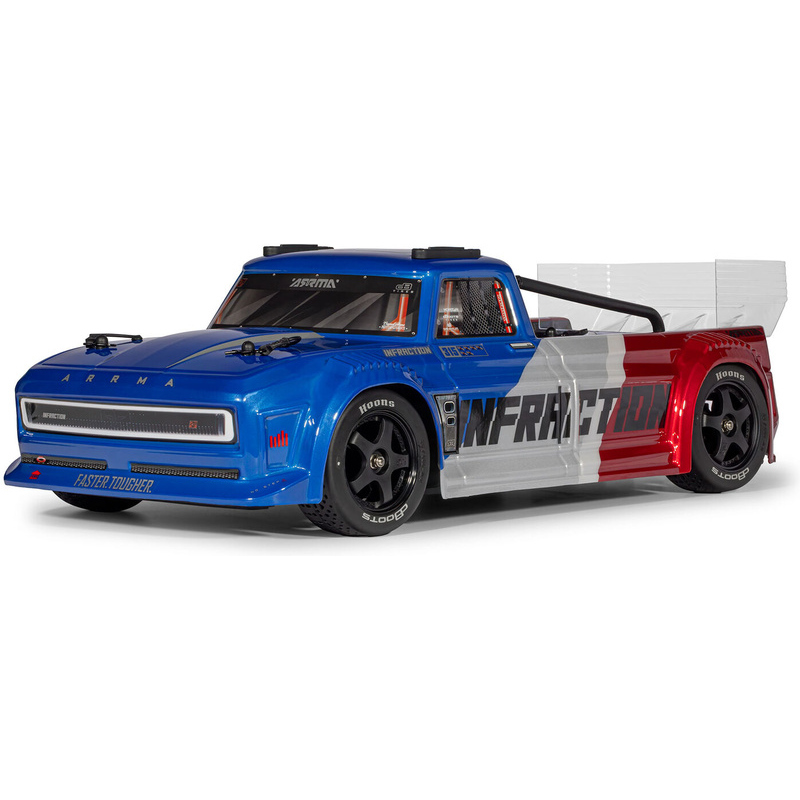 Vzrušující RC model auta Arrma Infraction 223S v měřítku 1:8. Koncepce modelu typu Street Bash je zaměřena na zábavnou jízdu na tvrdých rovných površích. Každé parkoviště, ulička nebo hřiště se tak může stát vaší dráhou. S náhonem 4WD, nezávislým zavěšením, nápravovými diferenciály, olejovými tlumiči a výkonným střídavým pohonem, poskytuje model neuvěřitelnou hbitost, akceleraci a dosáhne rychlosti až 100 km/h (s přibaleným rychlostním pastorkem). Obsažena je exkluzivní stabilizace jízdy DSC. Ještě lepší pocit z jízdy a větší odolnost přinášejí novinky v podobě pneumatik s integrovaným pásem, přepracovaného pohonného ústrojí s kovovými hruškami diferenciálů a středovým absorpčním členem místo třecí spojky. Dále jsou nově instalovány silikonové dorazy tlumičů. Ať už jste nováčkem v jízdě na silnici nebo zkušeným řidičem, model umožňuje pomocí různých funkcí a výběru akumulátoru, přesně upravit vlastnosti dle vašich potřeb.