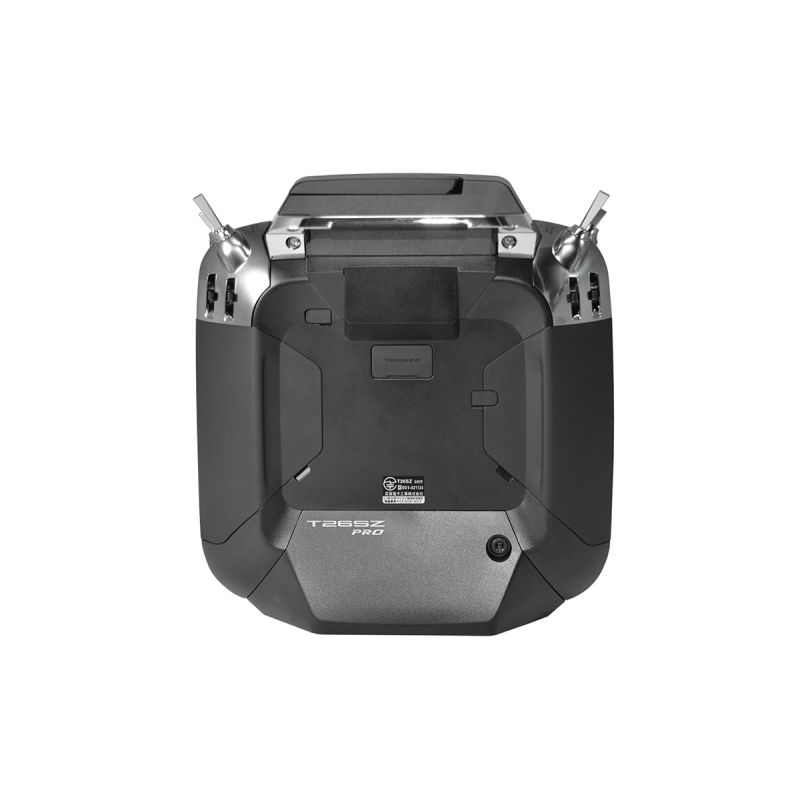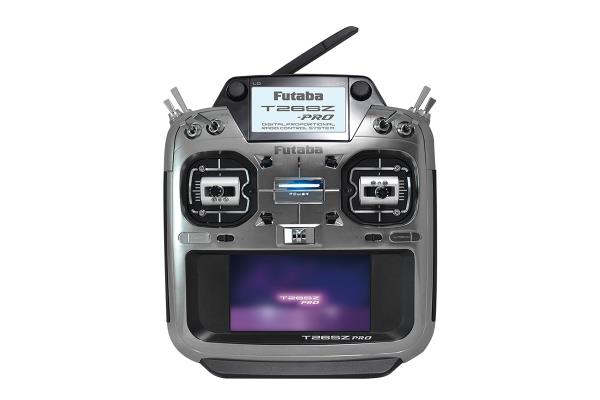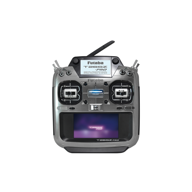 Vysílač T26SZ PRO ve skříňce dokonale padnoucí do ruky je vybaven přesnými celokovovými křížovými ovladači s nastavitelnou aretací/neutralizací, úhlem sklonu páky a mechanicky nasatvitelným rozsahem pohybu nahoru/dolů i vlevo/vpravo. Místo obvyklých potenciometrů jsou osazeny magnetické enkodéry zajišťující vysokou životnost a stálost parametrů. T26SZ diaponuje 8 přepínači, 4 posuvnými ovladači, 6 digitálními trimy a 2 otočnými proporcionálními ovladači. K programování slouží dvojice tlačítek a velký podsvícený barevný dotykový LCD displej zajišťující snadnou orientaci v intuitivním menu. vybrané údaje teůemetrie nebo časomíry je možno zobrazovat na pomocném LCD displeji na horní straně vysílače. T26SZ PRO má paměť pro 30 modelů neomezeně rozšiřitelnou pomocí mikroSD karty a širokou škálu pokročilých mixových funkcí pro akrobatická letadla, větroně, vrtulníky a multikoptéry. Kromě zobrazení telemetrických dat na displeji je k dispozici hlasový výstup telemetrie v zásuvce pro sluchátko (není součástí soupravy). T26SZ PRO je rovněž vybaven zásuvkou učitel-žák a zásuvkou pro programování a nastavování S.BUS serv a gyroskopických systémů CGY770/CGY755/CGY760R nebo GYA553/573. USB nabíjecí/datová zásuvka na horní straně vysílače možňuje používat T26SZ PRO po připojení k PC USB kabelem jako ovladač pro RC simulátor bez potřeby dodatečného USB rozhraní.