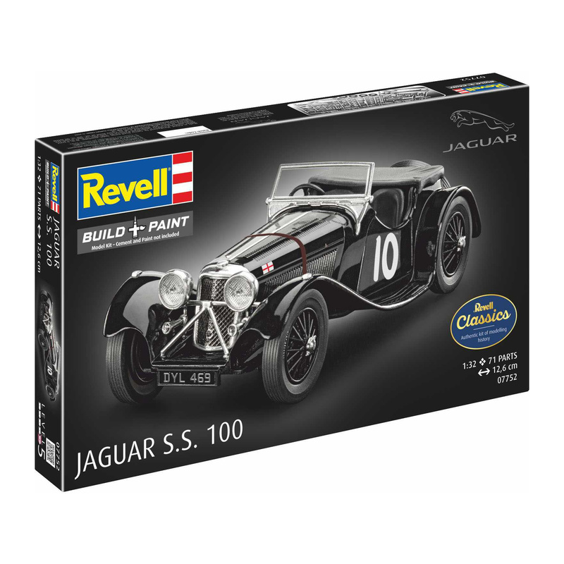 Revell plastikový model auta Jaguar SS 100 v měřítku 1:32 ke slepení. Stavebnice obsahuje 71 dílků, obtížnost 5.
