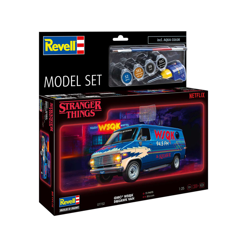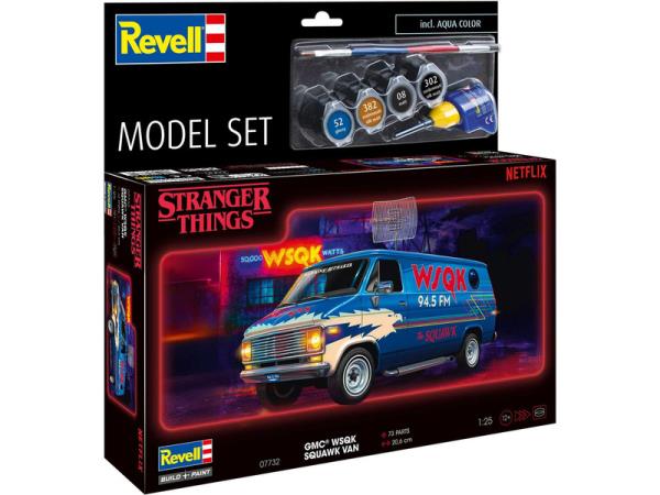 Revell plastikový model auta Stranger Things - GMC® WSQK Squawk Van v měřítku 1:25 ke slepení. Stavebnice obsahuje 73 dílků, obtížnost 3.