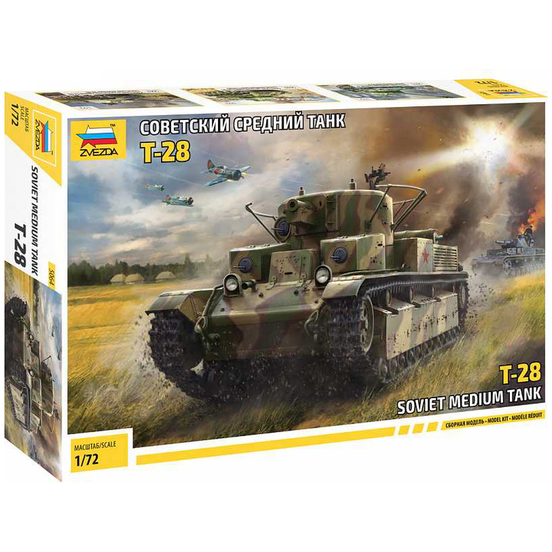 Plastikový model Zvezda 5064 – střední tank T-28 v měřítku 1:72. Stavebnice obsahuje 201 dílků, délka 100 mm.