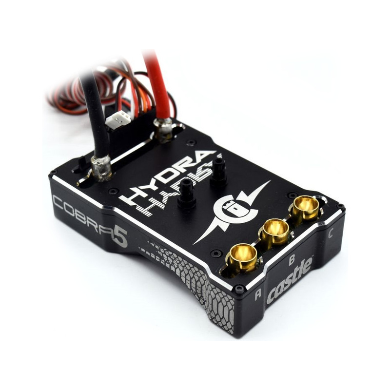 HYDRA Cobra 5 vychází z oblíbeného a výkonného regulátoru Cobra 5. Regulátor je vybaven dvěma výstupními fitinky 0.17". Fitinky jsou v horní desce našroubovány ve standardním závitu 10-32 UNF. Elektronika je umístěna v robustním CNC hliníkovém pouzdře a zalita ve vodotěsném epoxidu pro ochranu. Tento systém minimalizuje riziko vniknutí vody k elektronice a podporuje efektivní přenos tepla. Regulátor je dále vybaven zlacenými konektory pro zapojení motoru, trojbarevnou LED indikací a vypínačem s pryžovou krytkou (proti vnikání nečistot). Vstupní kabely napájení jsou pocínované, záleží na Vás jaký konektor máte v modelu.