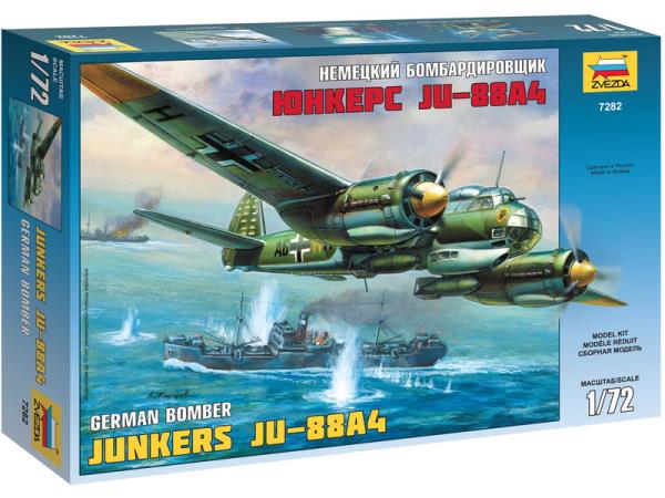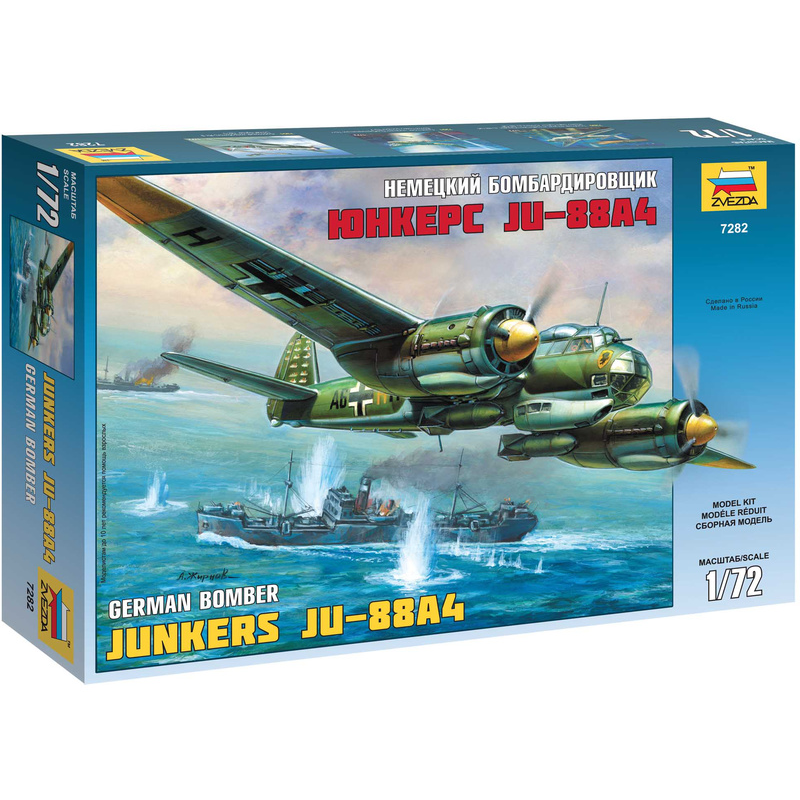 Plastikový model letadla Zvezda 7282 - Junkers Ju-88A4 v měřítku 1:72 ke slepení. Stavebnice obsahuje 335 dílků, délka modelu je 327 mm.