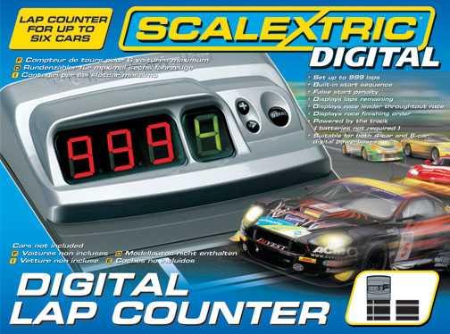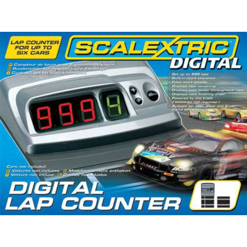 Digitální počítadlo kol udělá z vašeho závodu na trati Scalextric Digital ještě prestižnější záležitost. Počítadlo odpočítává počet kol zbývajících do konce vašeho závodu. Nastavit si můžete libovolnou hodnotu (do maximálního počtu 999 kol) vhodnou pro sprinterské závody i pro jízdy výdrže. S tímto stavebním prvkem budou vaše závody realističtější než kdy dřív. Digitální počítadlo kol ukazuje počet kol zbývajících do konce závodu spolu s počtem vedoucího závodníka. Na konci závodu ukáže počítadlo závěrečné pořadí. Počítadlo je napájeno z trati, tudíž nepotřebujete žádné další baterie. Použitelné spolu s řídící jednotkou pro závody 4 aut a také s dílem C7041 (boxy mechaniků). Požadavky na baterie: žádné