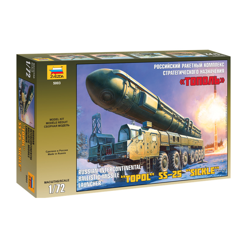Plastikový model Zvezda 5003 - ruský strategický raketový systém "Topol" v měřítku 1:72 ke slepení. Stavebnice obsahuje 309 dílků, délka 310 mm, obtížnost 3.