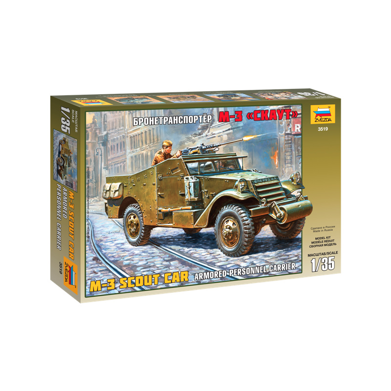 Plastikový model Zvezda 3519 - amerického průzkumného vozidla M-3 Scout v měřítku 1:35 ke slepení. Stavebnice obsahuje 171 dílků, délka 160 mm.