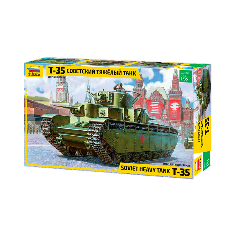 Plastikový model Zvezda 3667 - sovětský těžký tank T-35 v měřítku 1:35 ke slepení. Stavebnice obsahuje 478 dílků, délka 277 mm, obtížnost 3. Ačkoliv se T-35 vůbec neosvědčila v boji, přesto se vepsala do ději sovětské vojenské techniky.