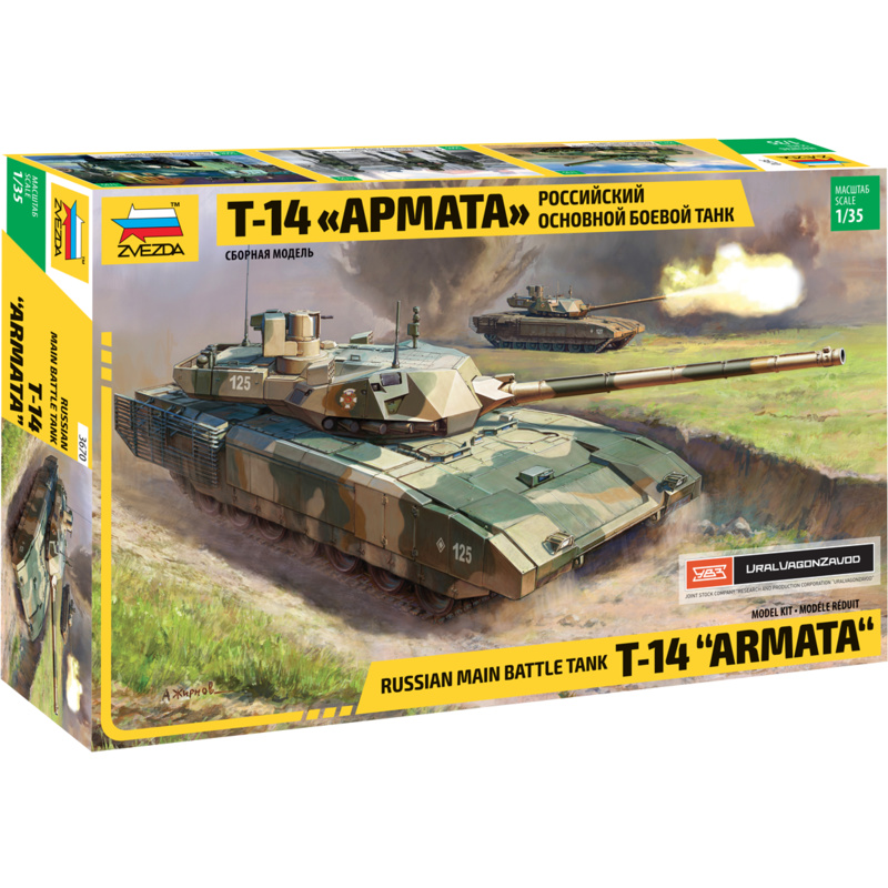 Plastikový model Zvezda 3670 - ruský tank T-14 "Armata"" v měřítku 1:35 ke slepení. Stavebnice obsahuje 410 dílků, délka 300 mm, obtížnost 3.