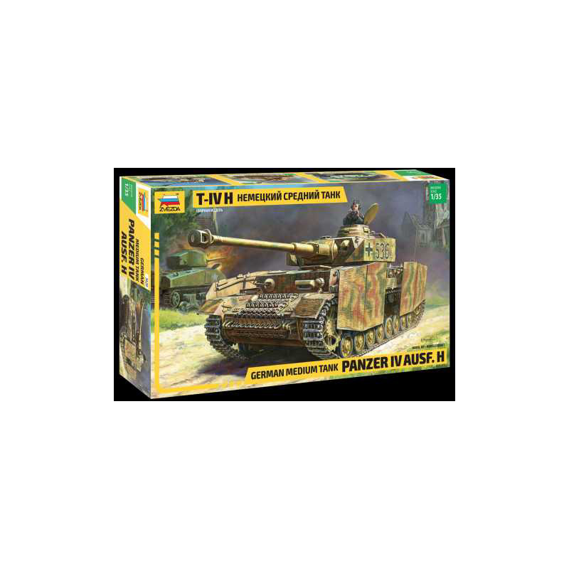 Plastikový model Zvezda 3620 - německý střední tank T-IV (H) v měřítku 1:35 ke slepení. Stavebnice obsahuje 545 dílků, délka 200 mm, obtížnost 3.